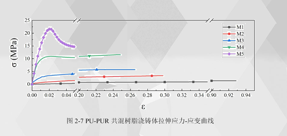通過(guò)數(shù)值計(jì)算得到PU-PUR共混樹脂澆鑄體的拉伸應(yīng)力-應(yīng)變曲線如圖2-7所示。從曲線中可以看出,隨著聚脲所占比例的不斷增加,拉伸應(yīng)力-應(yīng)變曲線開始表現(xiàn)出更多的塑性形變特征,曲線上出現(xiàn)屈服階段,在M3、M4和M5中,即聚脲成分占共混樹脂比例達(dá)到50%及以上時(shí)屈服階段表現(xiàn)地更明顯。同時(shí)由于聚脲所占比例的增加帶來(lái)硬段成分的增加,使得拉伸試樣相比于較低聚脲含量的樹脂澆鑄體所能承受的拉伸位移更短。