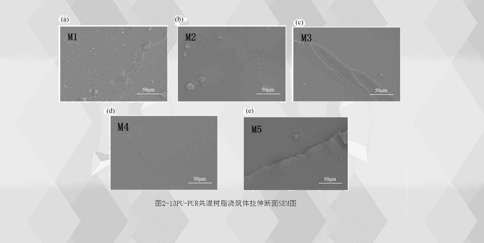 從聚氨酯和聚脲拉伸斷面的SEM2-13(a)(e)中看到,兩者的拉伸斷面都表現得較 為平整。其中聚氨酯斷面有很多塊狀顆粒分布在表面,表現出粗糙坑洼不平的現象,聚脲斷面表現得更加平整,兩者都沒有出現分相。從M2M3M4拉伸斷面的SEM 2-13(b~d)中看到,斷面光滑而平整,沒有出現分相,說明聚氨酯和聚脲的樹脂共混體系界面相容性很好。