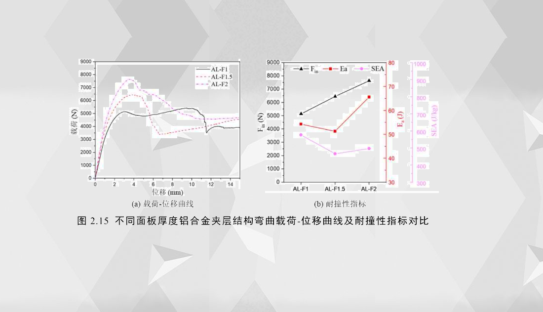 圖2.15(a)比較了不同面板厚度的鋁合金夾層結構載荷-位移曲線。AL-F的載荷-位移曲線為具有兩個峰值載荷的曲線類型Ⅱ,臨界失效模式為壓痕(IN),其第二個峰值力下降的原因是試樣位移達到10m左右時,夾層結構的一側發(fā)生下界面失效并隨后附帶泡沫芯層的剪切裂紋,導致載荷顯著下降,從而嚴重降低了結構的能量吸收能力。與AL-F1不同的是,AL-F1.5和AL-F2的臨界失效模式為芯層剪切(CS),兩者的載荷-位移曲線屬于曲線類型Ⅱ,載荷在達到臨界載荷后先下降,然后保持相對穩(wěn)定。AL-F1.5和AL-F2的區(qū)別在于,前者在臨界載荷之后的5.3mm左右發(fā)生界面失效,使其載荷下降的速度比AL-F2快,而后者的后屈曲變形模式只是芯層剪切(CS)的演變。從臨界失效模式后的載荷變化趨勢來看,芯層剪切(CS)之后的載荷-位移曲線的變化趨勢明顯大于壓痕壓入(IN)的變化。