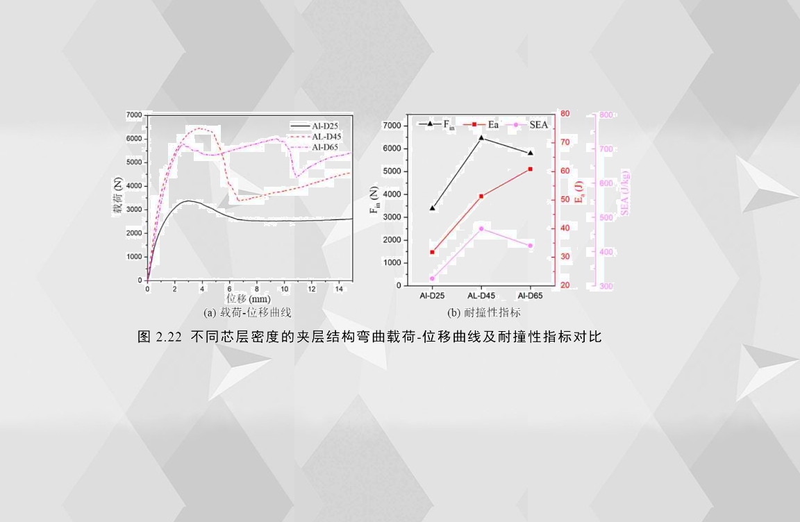 對不同芯層密度的鋁合金夾層結構而言,其載荷-位移曲線和壓潰過程差別較大,如圖2.22(a)所示,芯層密度為0.25g/cm3的AL-D25和芯層密度為0.45g/cm3AL-D45的載荷-位移曲線屬于類型I,芯層密度為0.65g/cm3的AL-D65的屬于類型Ⅱ,AL-D25的臨界失效模式為芯層剪切(CS),臨界載荷最小,由于其芯層密度較低,其后期主要失效形式還是以剪切裂紋為主,后屈曲壓潰力與臨界失效載荷相比相差不大。AL-D45的臨界失效模式也為芯層剪切(CS),其臨界載荷是三者中最大的,在臨界失效之后小段位移耦合了下界面失效,其載荷下降很快,嚴重降低了試件吸能。值得注意的是,雖然AL-D65的芯層密度比AL-D45的大,芯層可以承受的剪切強度大,但AL-D65的芯層的平均胞元大小比AL-D45的小,界面的強度比AL-D45的小,而在加載過程AL-D65的界面能承受的剪切強度比芯層能承受的剪切強度小,所以發生了界面分離的臨界失效模式,使得AL-D65的臨界載荷反而比后者的小。雖然AL-D65在彎曲位移2.5mm左右處發生界面失效,但其失效界面的位置為上膠層,位移相對較小,試件整體的承載能力還很強,所以其載荷下降的幅度比例相對AL-H10更小,所以前者的吸能效果更佳。