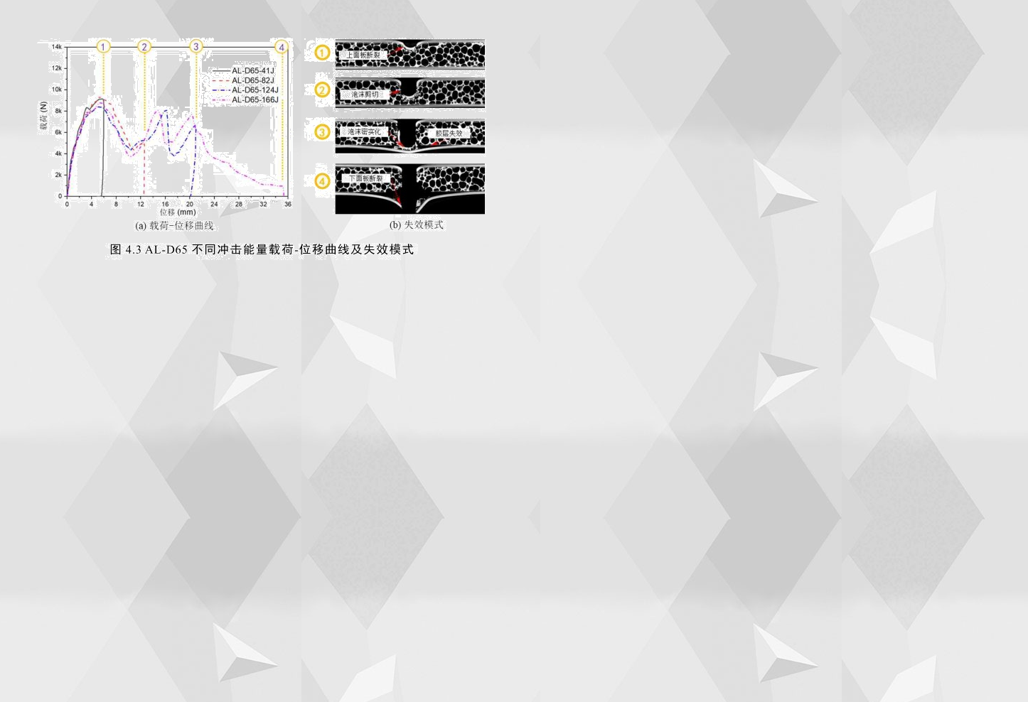從圖4.3中AL-D65在166J沖擊能量下的載荷-位移曲線可以看出,其曲線有三個峰值載荷,結(jié)合各沖擊能量下的失效模式可以看出,AL-D65與AL-F2的失效機理有一定程度的相似性,兩者均是由于上面板裂紋的出現(xiàn)導(dǎo)致第一次峰值載荷下降以及下面板裂紋的出現(xiàn)導(dǎo)致最后一次峰值載荷下降,并且都由于泡沫芯層的密實化導(dǎo)致載荷在第一次波谷后繼續(xù)上升;而不同之處在于,AL-D65的下面板與膠層之間出現(xiàn)失效分離,如圖4.3(b)中③所示,再結(jié)合AL-D65的載荷-位移曲線可以看到,②與③之間存在一個峰值載荷,而導(dǎo)致AL-D65第二個峰值載荷下降的原因是由于下面板與膠層之間出現(xiàn)失效分離。
